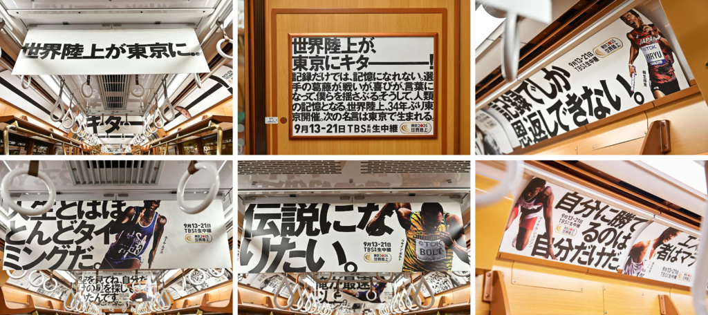 東京メトロ銀座線のレトロライナー車両では、カール・ルイスやウサイン・ボルト、桐生祥秀といった名選手たちの「言葉」に焦点をあてた広告を展開。