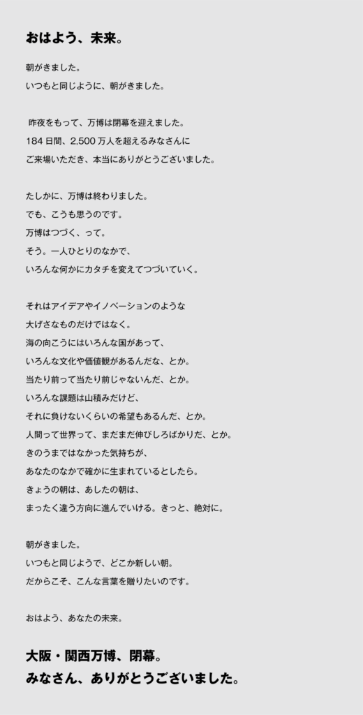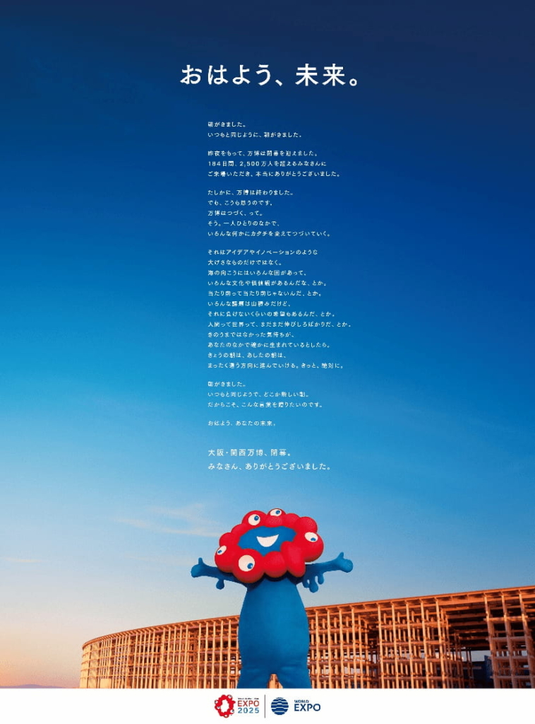 「おはよう、未来。」万博閉幕をやさしく照らすコピーのデザイン
