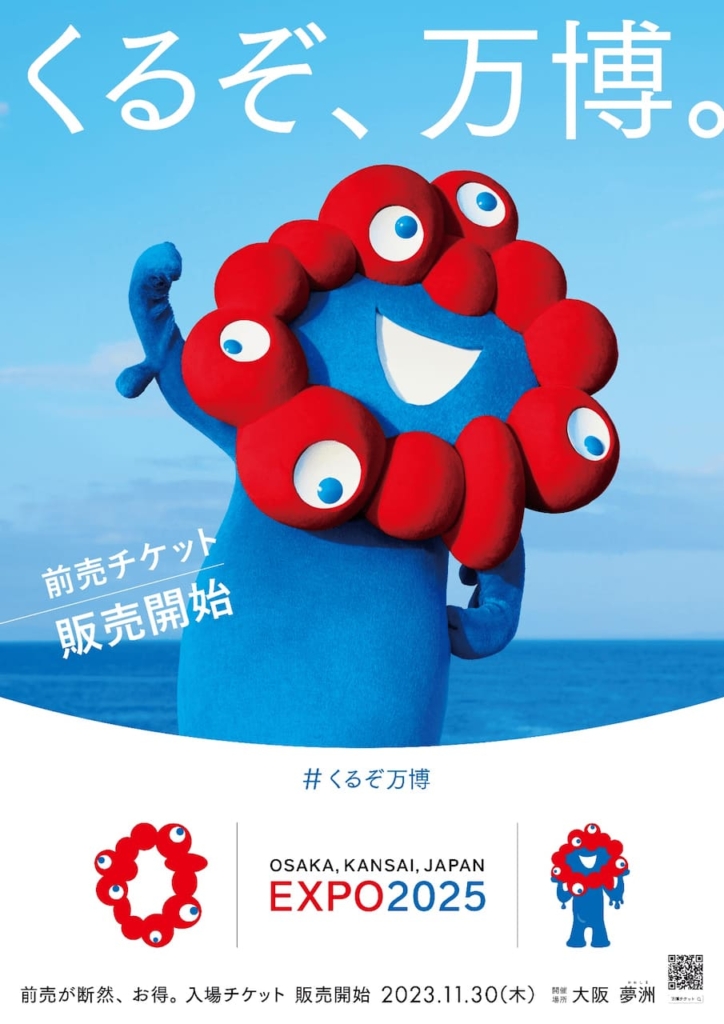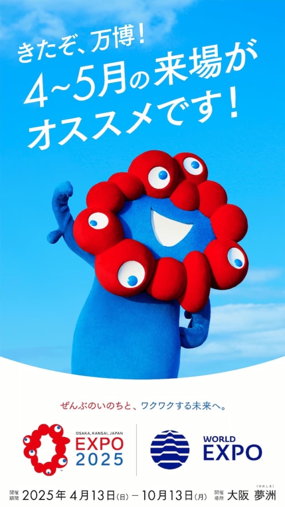 ビジュアルに登場するのは、清々しい青空と、大屋根リング、そしてミャクミャク。