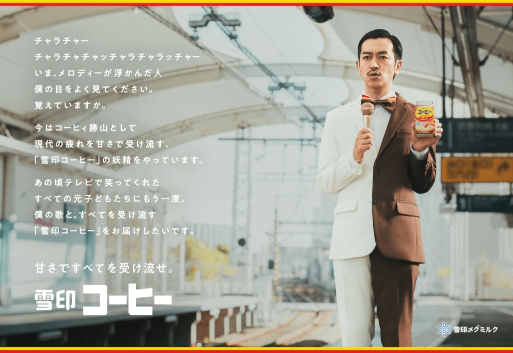 彼を「雪印コーヒー」の妖精“コーヒィ勝山”として起用し、2025年4月からシリーズ企画を展開しています。仕事や人間関係など、日常でちょっと疲れた人に向けて、「雪印コーヒーの甘さでふっと力が抜ける瞬間を届ける」ことをテーマにしたユニークな広告です。