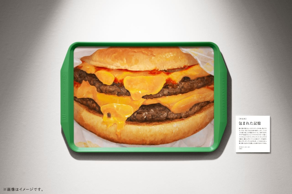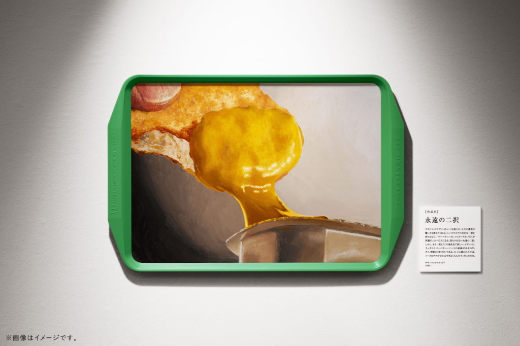 額縁には、店舗で実際に使われているトレーをモチーフにしたフレームを採用し、作品名や解説キャプションも添えられています。