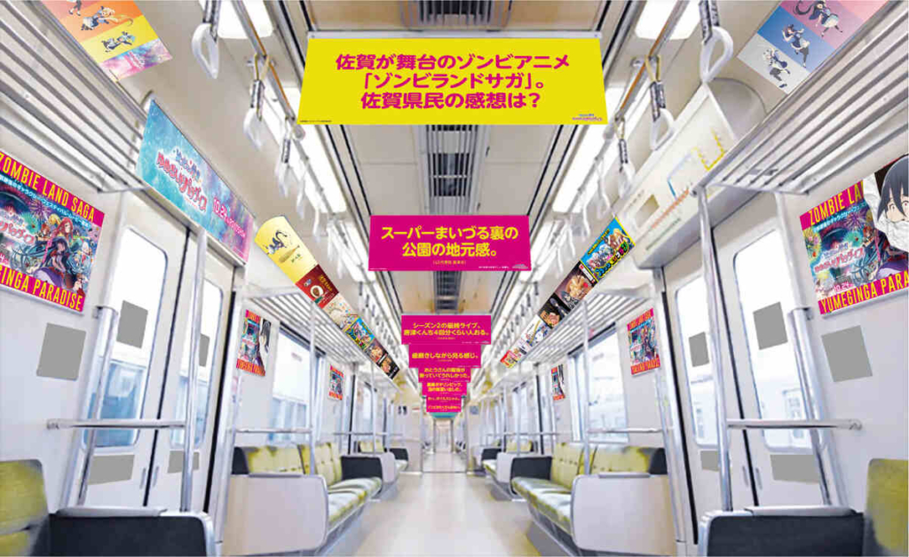 さらに、佐賀県内の企業9社とアニメキャラクターがコラボしたタイアップ広告も展開。作品世界と“実在の佐賀”が、車内で自然につながる構成になっています。