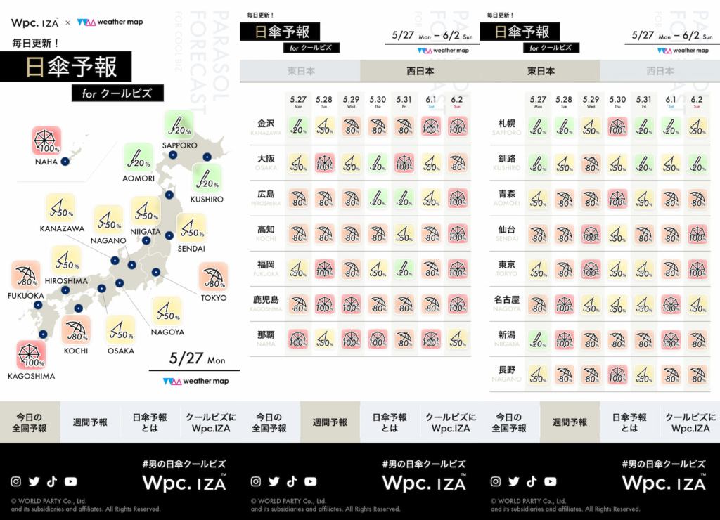 また、天気予報になぞらえた特設サイト「日傘予報 for クールビズ」も開設。気温や湿度、日射量などのデータから“日傘指数”を提示し、「日傘を使うかどうか」を判断する新しい指標をつくり出しています。