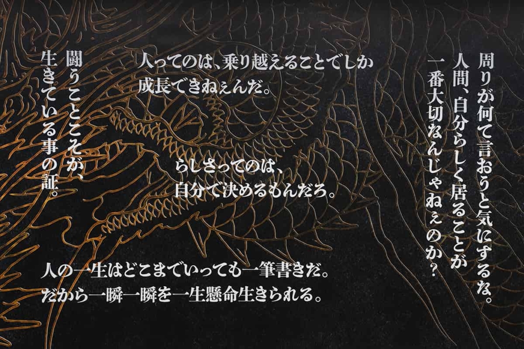 物語の軸となるのは、『龍が如く1』で主人公・桐生一馬が語る「自分の目で確かめるさ。人が何て言おうがなぁ。」という台詞。GEKI Inc.のアートディレクター・岸本真應氏は、「他者の評価や世間の声に流されず、自分の意思で選択して前に進む姿勢は、進学や就職、転職など、人生の節目に共通する普遍的なテーマだと感じました」と話します。この言葉を起点に、『龍が如く』の名言が人生のさまざまな場面で人を鼓舞し、決断を後押しする存在として描かれています。