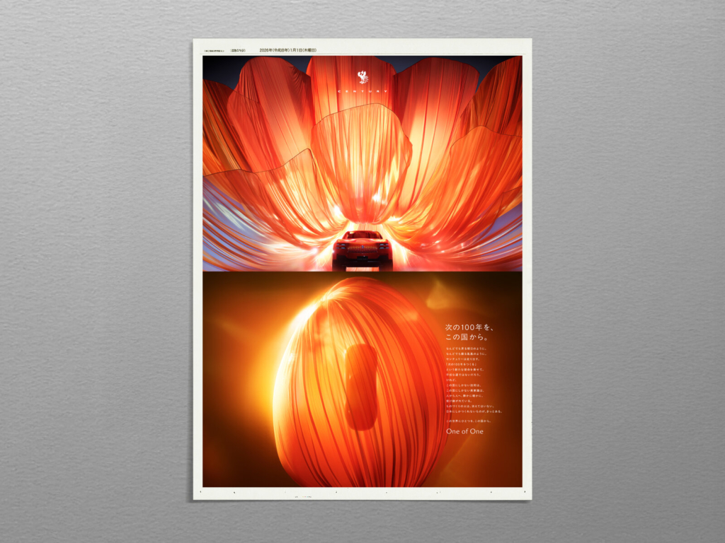元日の新聞広告には、その年の企業の意思や社会へのメッセージが色濃く表れます。2026年のトヨタ自動車の元日広告では、高級車「センチュリー」が主役に据えられました。全国紙と地方紙を含む計60紙に掲載された今回の広告は、昨年の「ジャパンモビリティショー」で話題となったオレンジ色のクーペを中心に、日の出や鳳凰を思わせる緋色のビジュアルが印象的な一枚です。