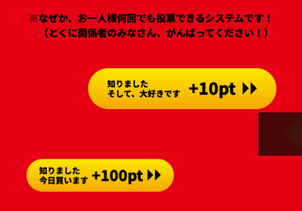 とはいえ、ガチすぎないのが金鳥流。「お一人様何回でも投票可能」「関係者のみなさまがんばって!」「1クリックで10pt/100pt入るドーピングボタン」など、どこか肩の力が抜けた“腰砕けサービス”も用意されていました。