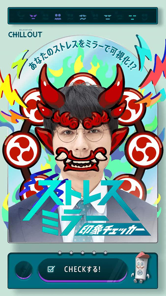 さらに、WebCMと連動したコンテンツ「ストレスミラー 印象チェッカー presented by CHILL OUT」も公開中。顔写真と簡単なチェック項目をもとに、13種類の“ストレス印象キャラ”の中から、自身のストレスタイプが診断される仕組みになっています。