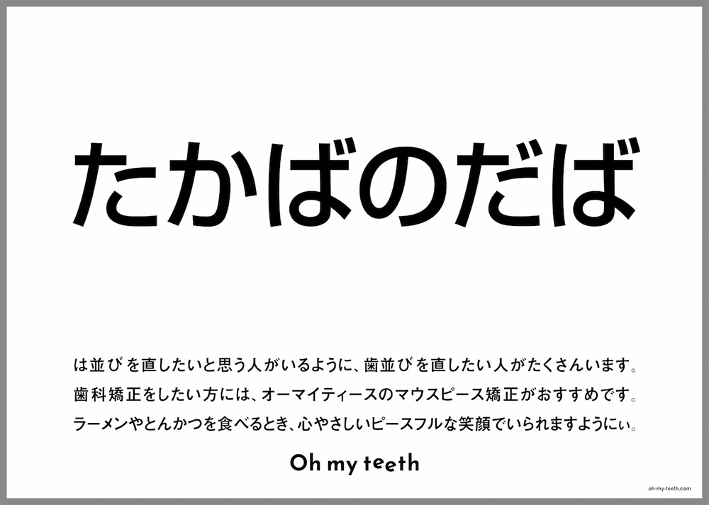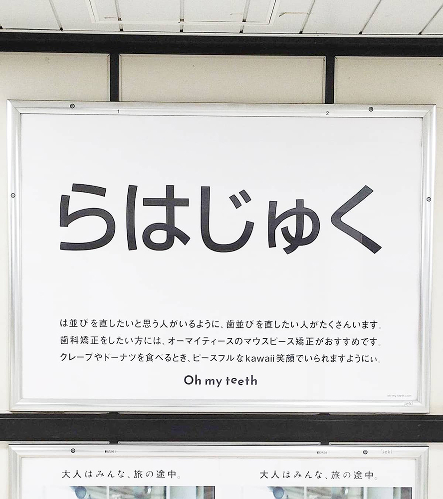 広告では、駅名に含まれる「は」の位置をあえてずらし、「らはじゅく」「いいばだし」「たかばのだば」「あきばはら」と表記。ぱっと見で違和感を覚える構成にしつつ、「歯並びを(正しい位置に)直したいと思う人がいるように、歯並びを直したい人がたくさんいます」というメッセージを添えています。