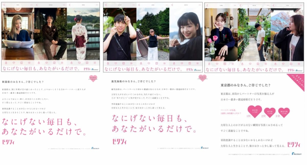 今回の屋外広告 「なにげない毎日も、あなたがいるだけで。」 は、『ゼクシィ』が全国のパートナーがいる人4888人を対象に実施したアンケート結果 をもとに制作されました。特に、特定の質問で1位となった 東京・鹿児島・新潟の3都県 では、それぞれの地域に合わせたメッセージを添えて展開されています。