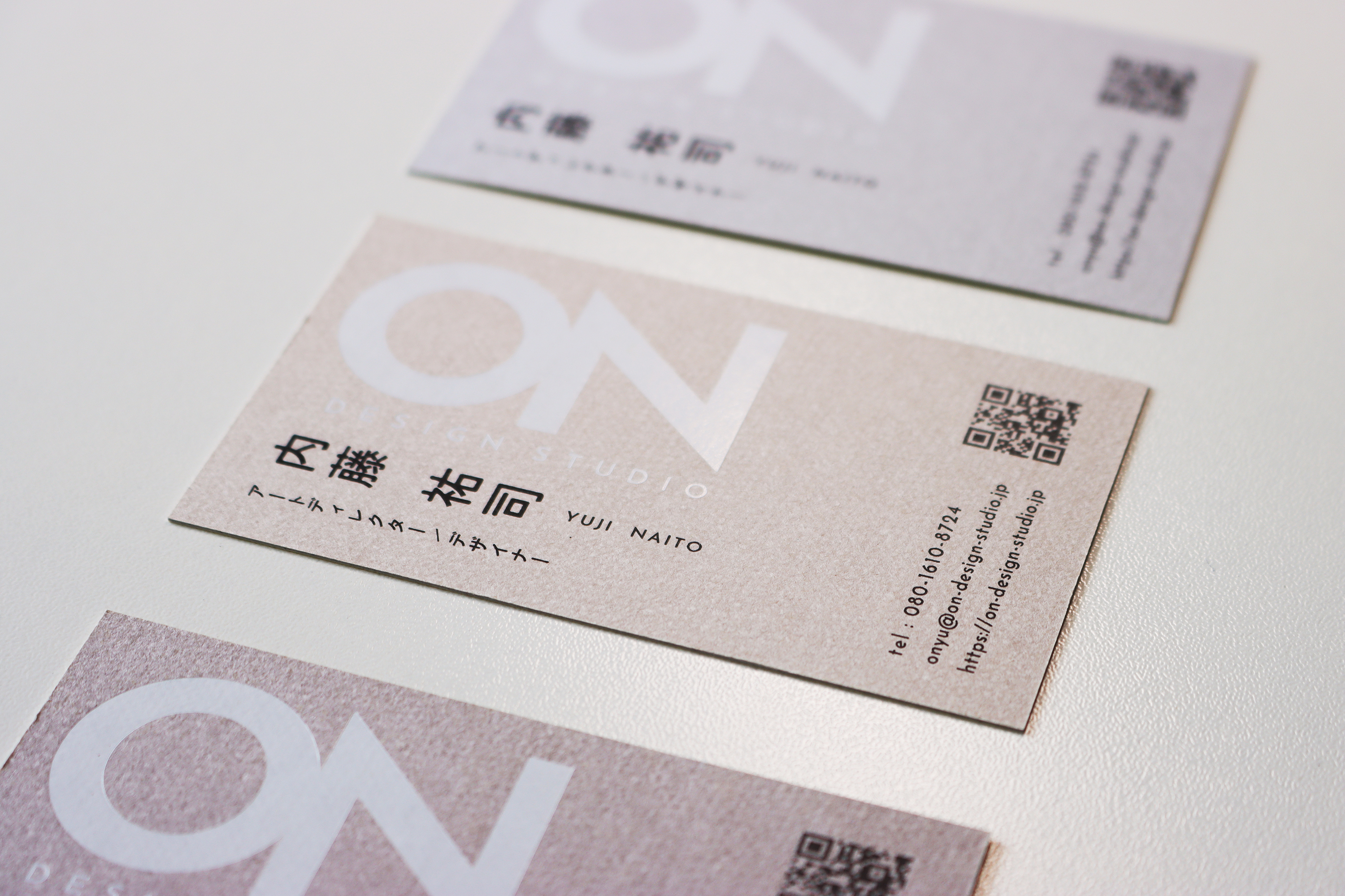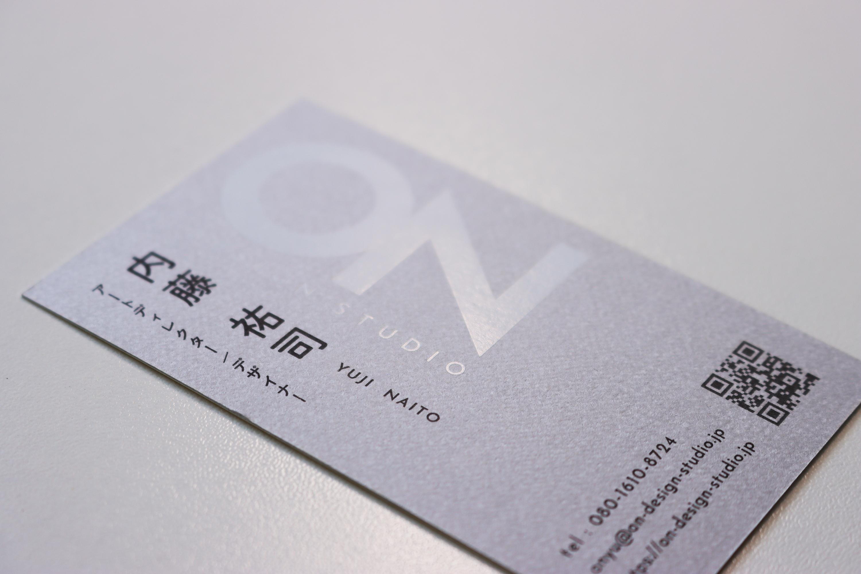 さらに、材質だけでなく、加工にもこだわりを持っています。名刺の両面に配置したロゴには、特別な箔押し加工を施しています。表面には黒のツヤ箔を使用し、裏面には白箔をあしらい、それぞれが印象的なコントラストを生み出しています。この細部への注意が、名刺全体の質感と印象を一層引き立てます。