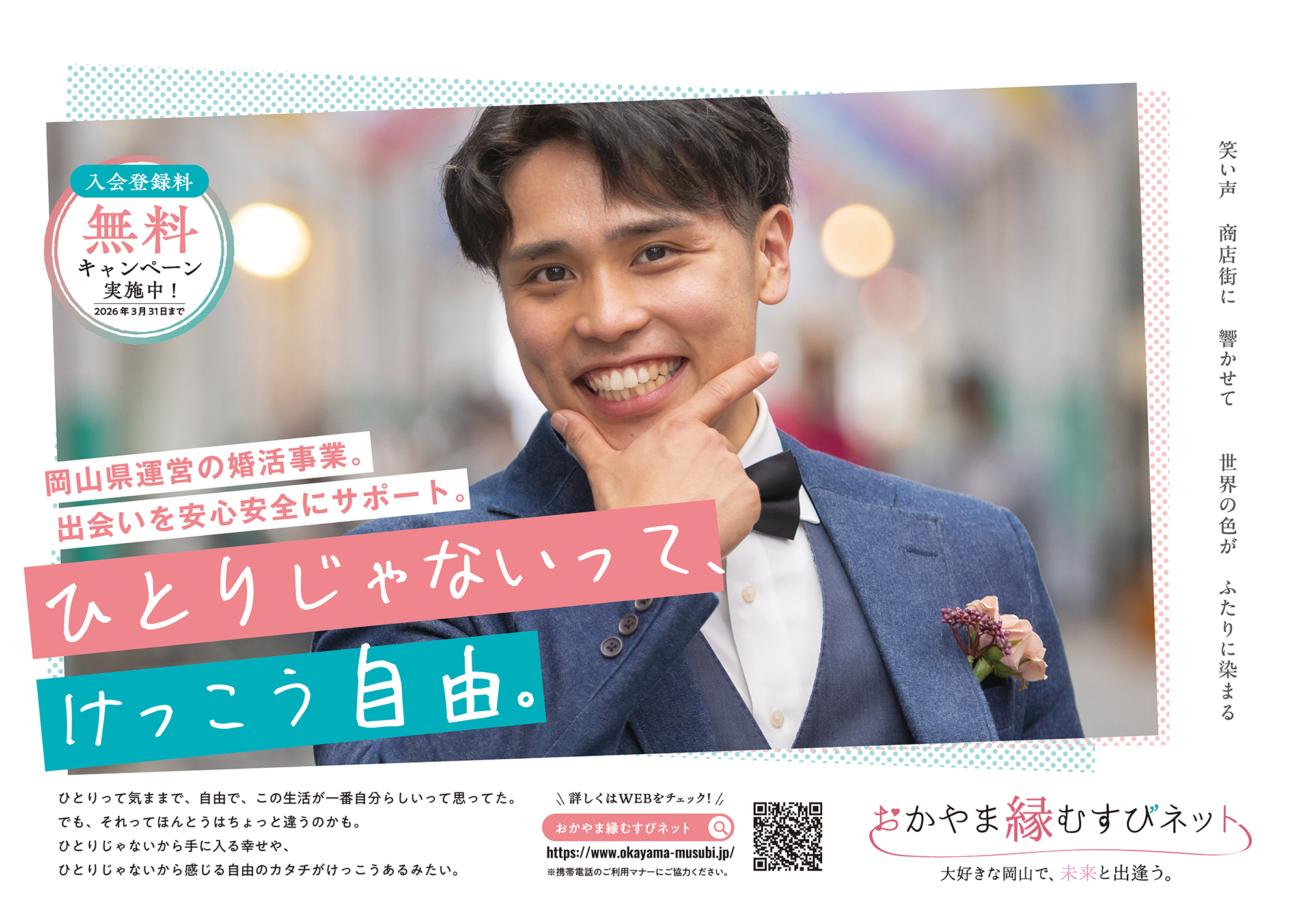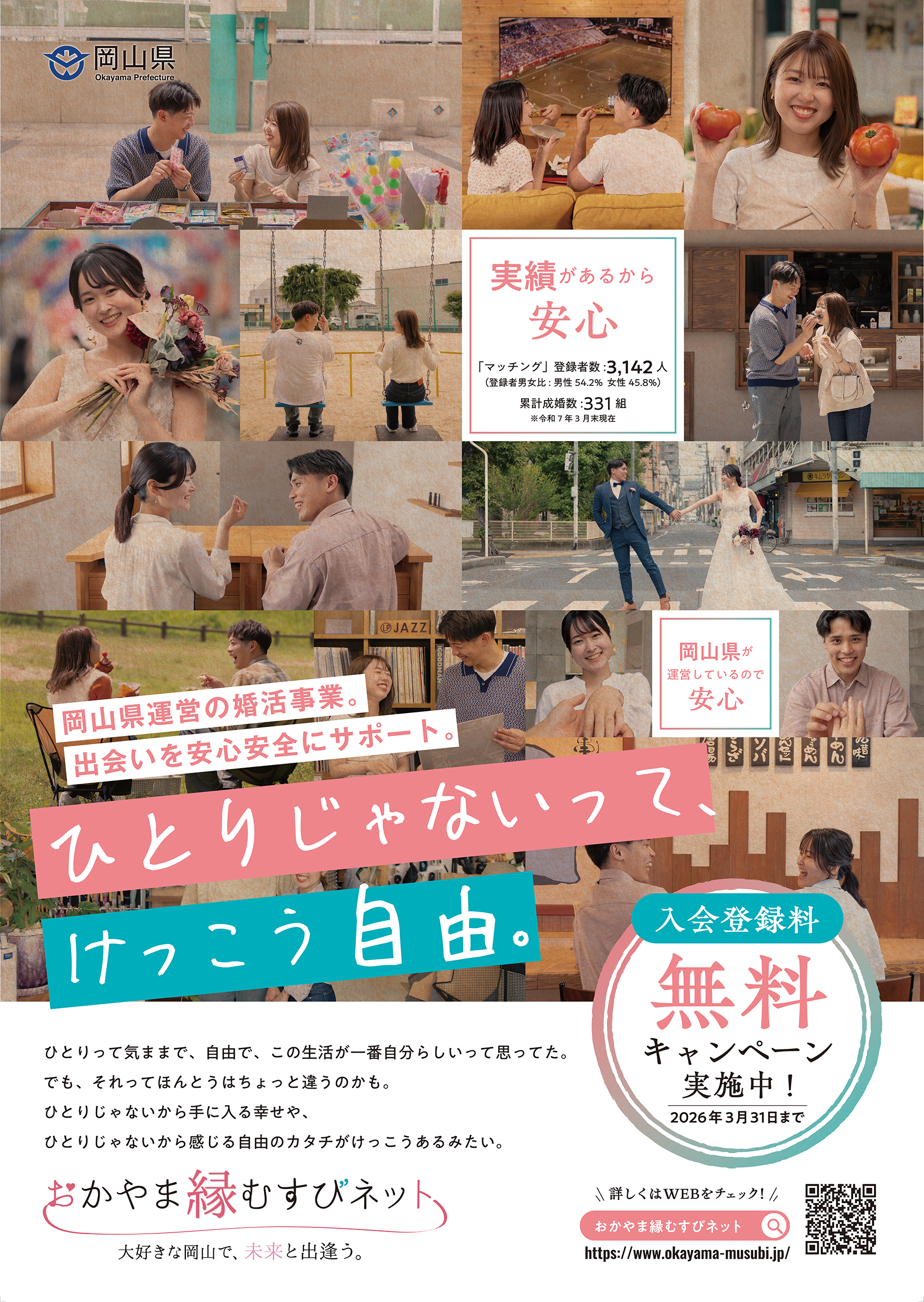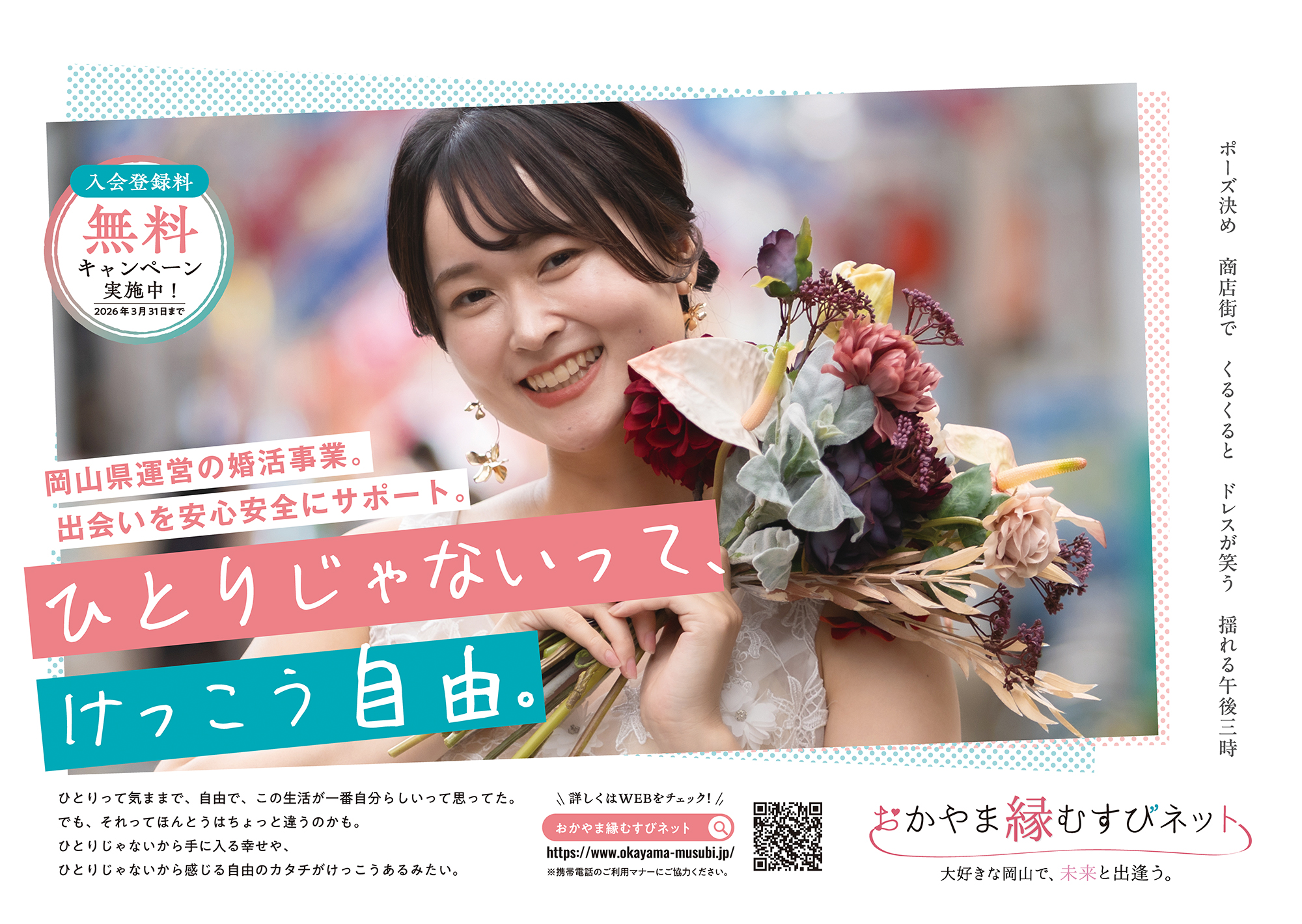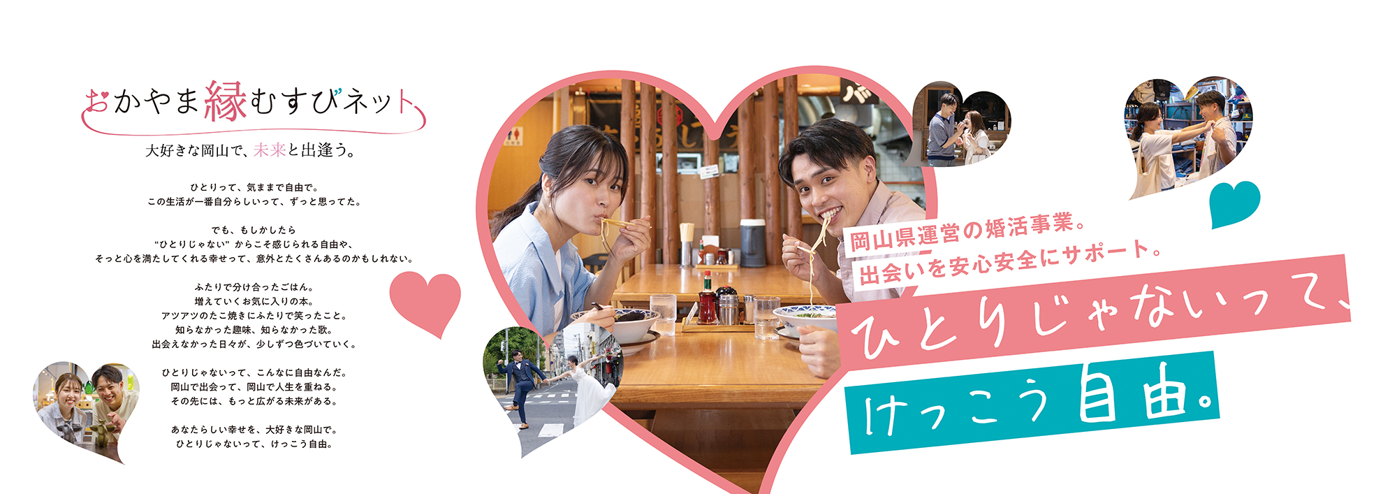 広告ビジュアルには、食事や買い物を楽しむカップルの自然な姿を用い、コピー「ひとりじゃないって、けっこう自由。」を添えることで、結婚を身近に感じてもらう設計としています。また、縁むすびネットへの導線としてQRコードを設置し、Webへのスムーズな誘導も行いました。