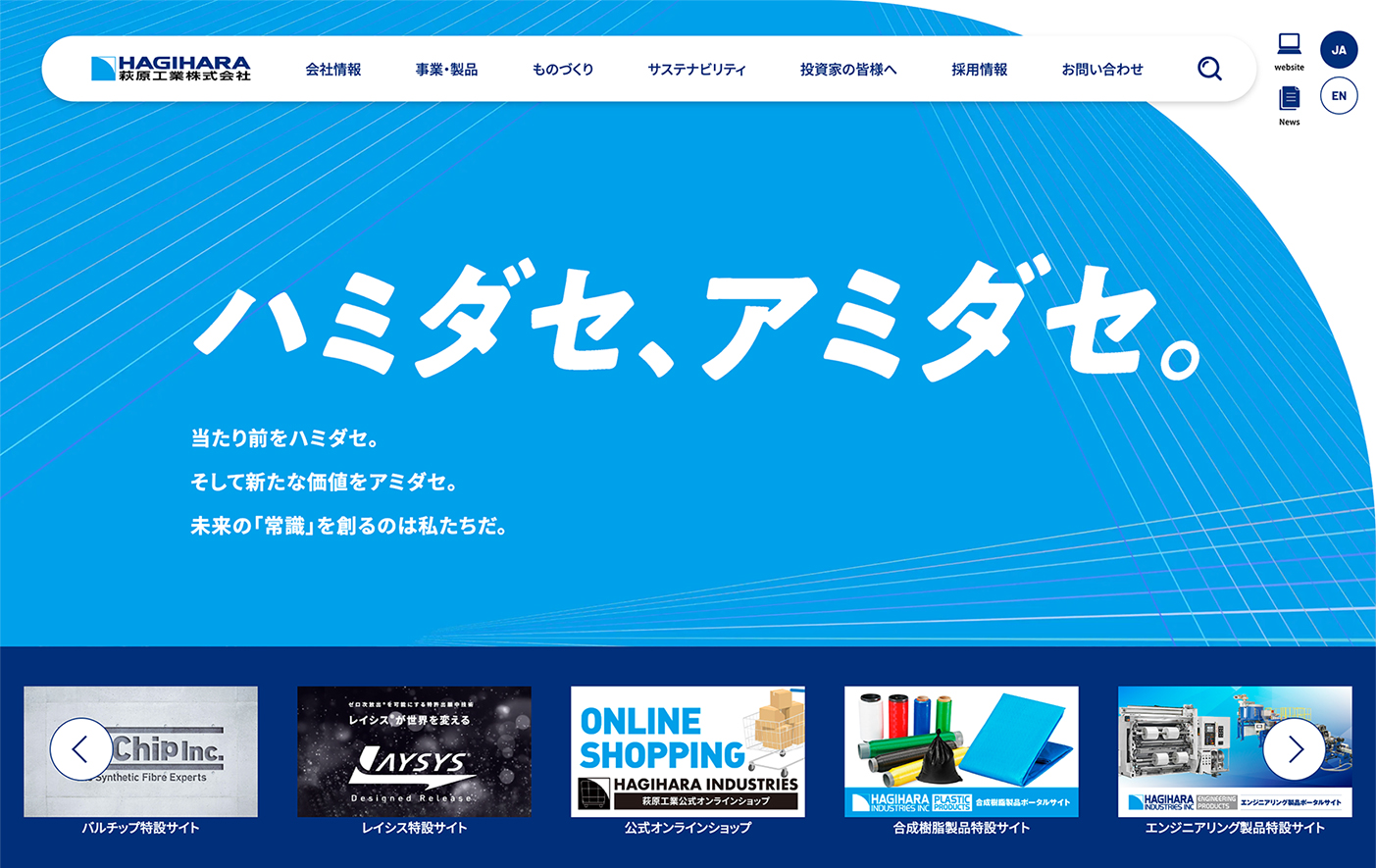 このたび、萩原工業株式会社様のWebサイトリニューアルにあたり、デザインを担当いたしました。同社の特長のひとつであるフラットヤーン技術に着目し、それを視覚的に伝えられるデザインを提案しています。フラットヤーンとは、ポリエチレンやポリプロピレンのフィルムを短冊状にスリットし、延伸することで強度を持たせた平らな糸のことです。